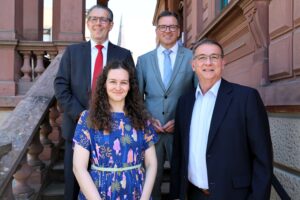 Bildunterschrift: Im Rahmen des Notartermins (v. l.): Landrat Peter Polta, Anja Bittner, Landrat Dr. Joachim Bläse, Ralf Bodamer – Bildnachweis: Landratsamt Heidenheim